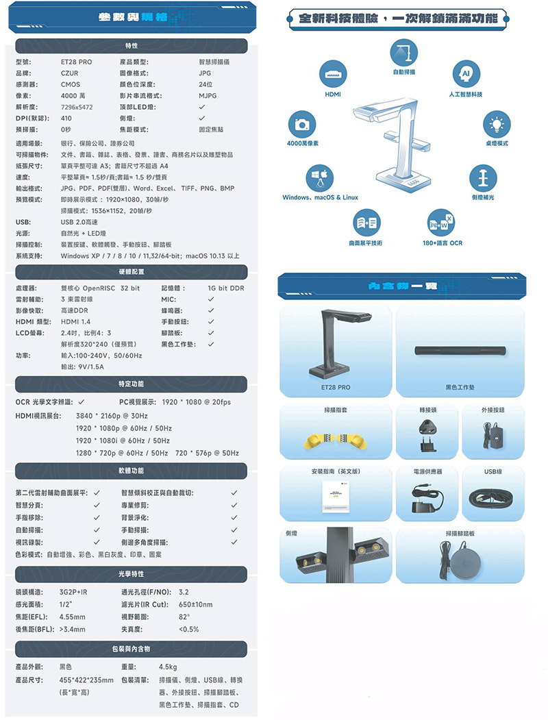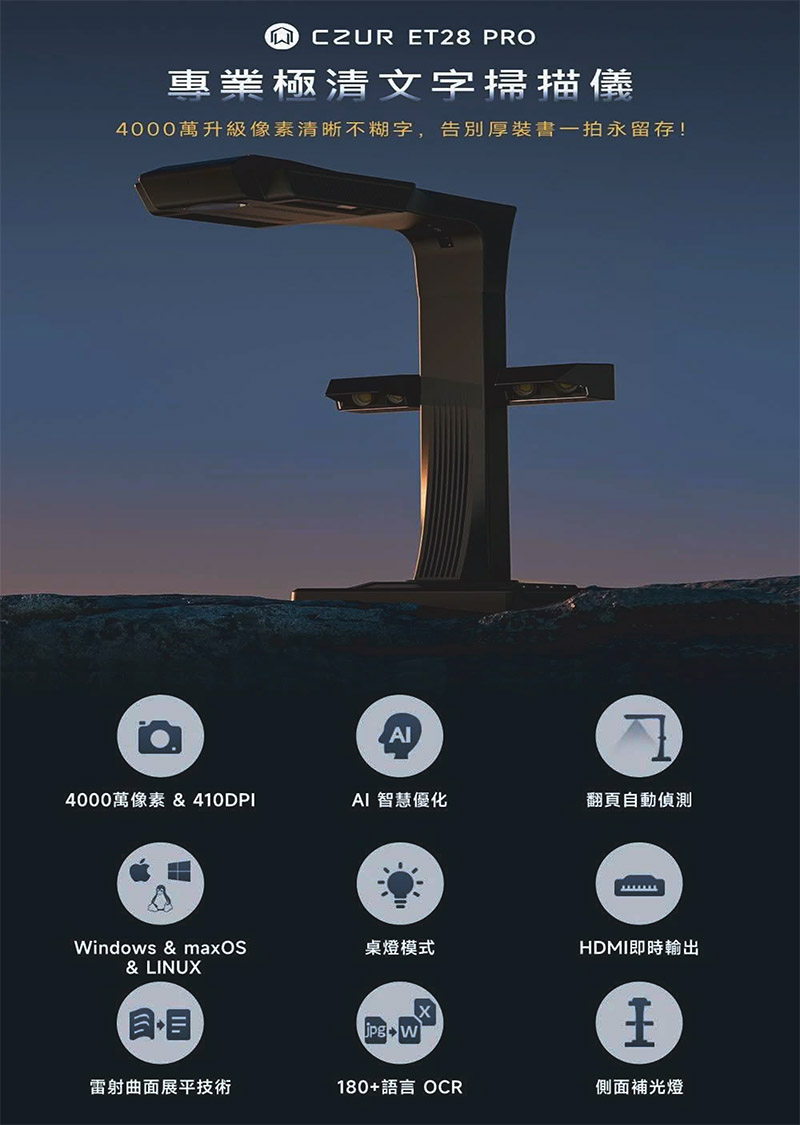 CZUR ET28 Pro 智慧型掃描器,專為高效率文件數位化需求所設計,結合高畫質鏡頭與智慧影像處理技術,讓掃描流程更加快速、直覺且不受紙張限制。無需傳統平板掃描器反覆掀蓋或拆裝文件,只需將資料攤開,即可完成掃描,大幅節省時間並避免文件損傷。