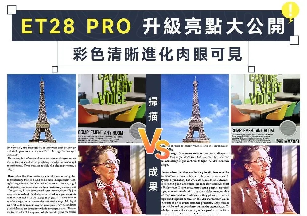 ET28 Pro 適用於書籍、合約、報表、講義、票據等多種紙本資料,特別適合需要大量數位化文件的辦公室、教育機構與研究單位。內建智慧影像校正功能,可自動進行裁切、攤平與陰影處理,讓掃描後的影像更加平整、易於閱讀與存檔。