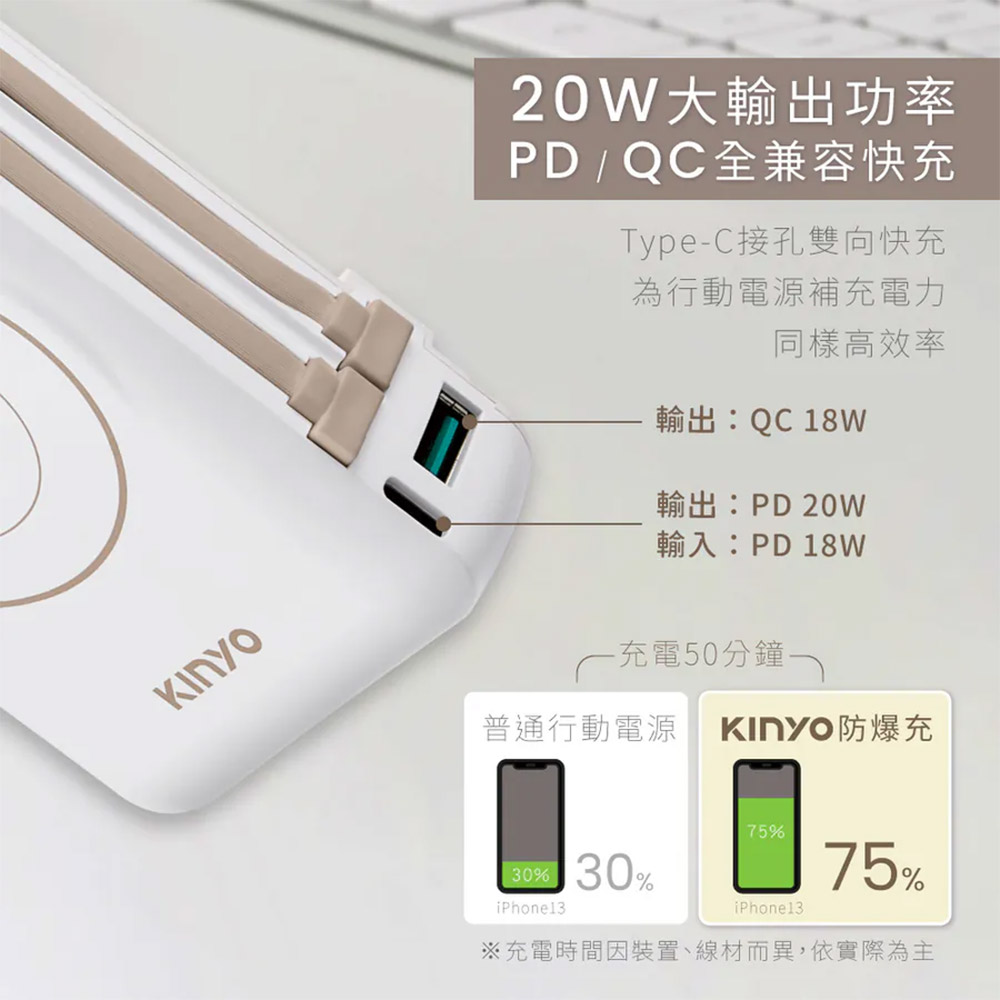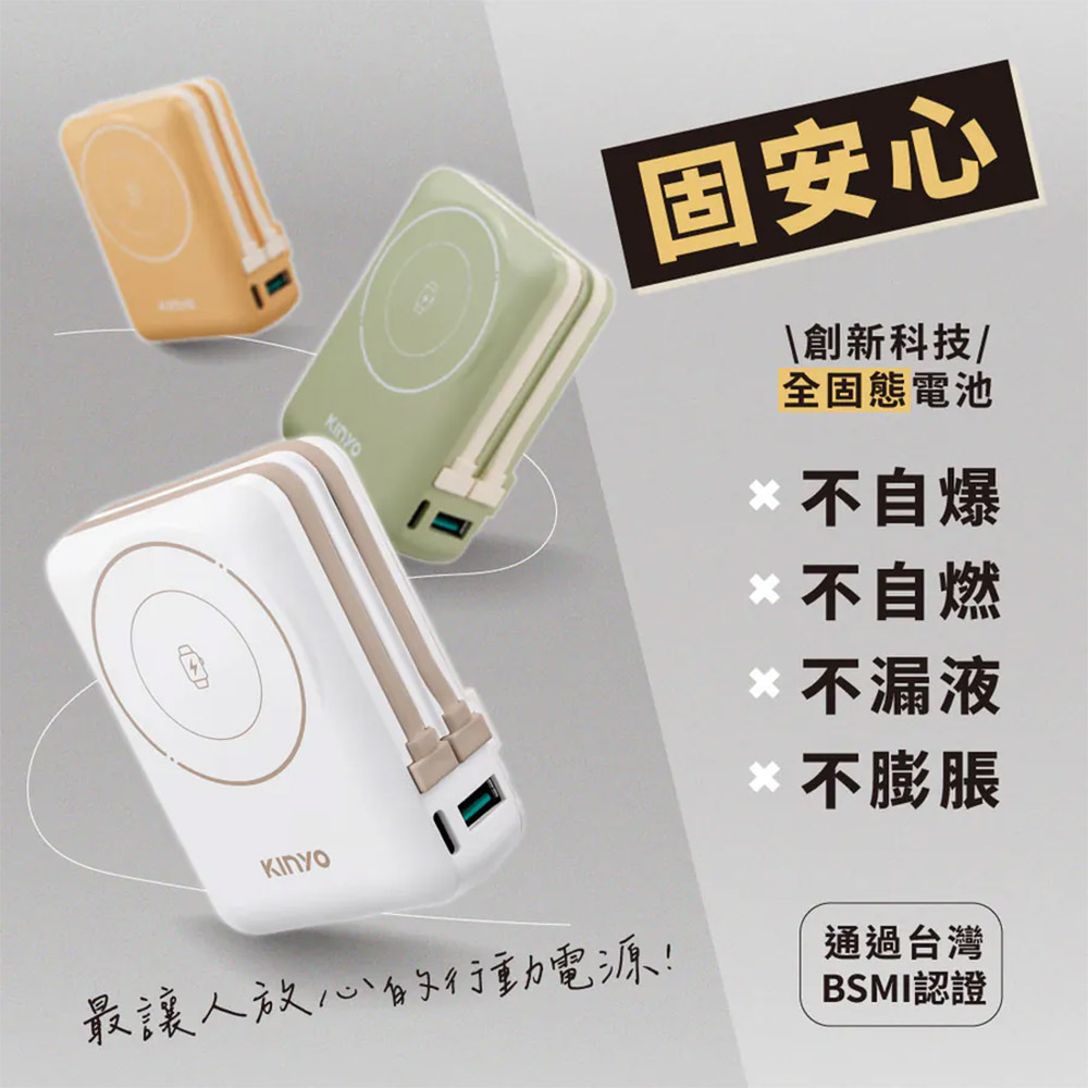 KINYO 全新推出 10000mAh 9in1自帶AC萬用防爆行動電源 KPB-2656,搭載固態電池技術,安全穩定不爆炸,出門使用更安心!支援 PD/QC 快充協定,最高 20W 快速輸出,無論是 iPhone、Android 還是 Apple Watch,都能即時補電。更內建 磁吸無線充電 與 雙線設計,讓你完全擺脫額外帶線的困擾。