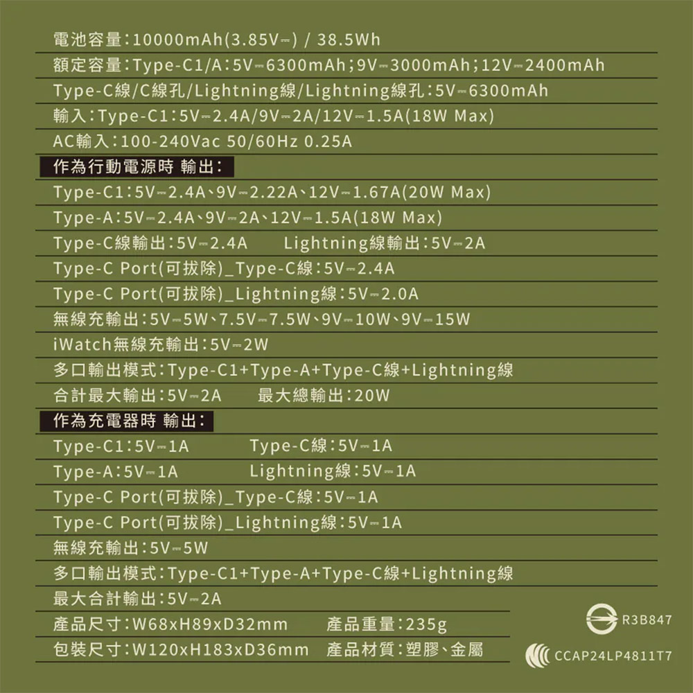 輸入:Type-C1:5V☆2.4A/9V☆2A/12V☆1.5A(18W Max) AC輸入:100-240Vac 50/60Hz 0.25A