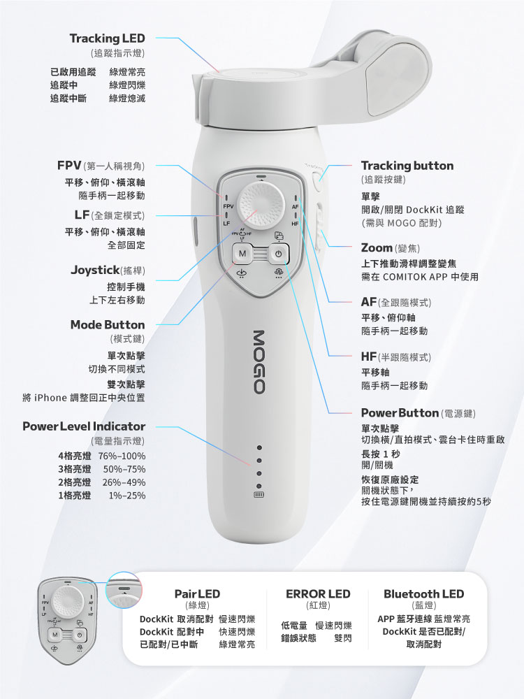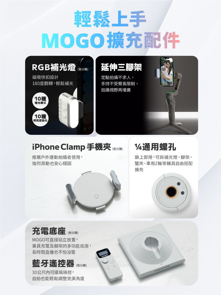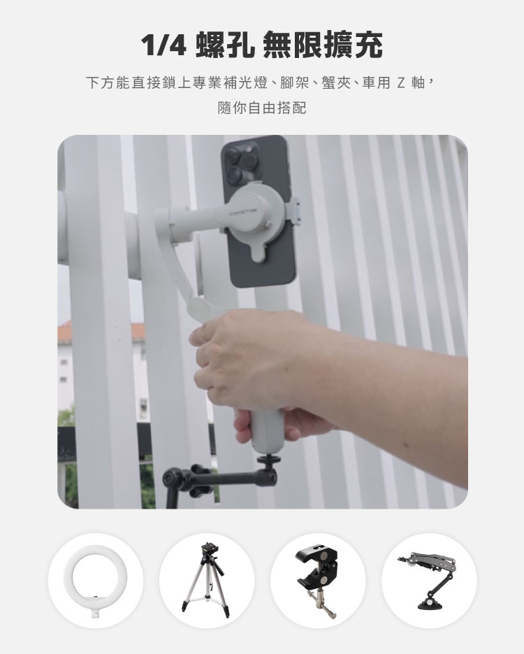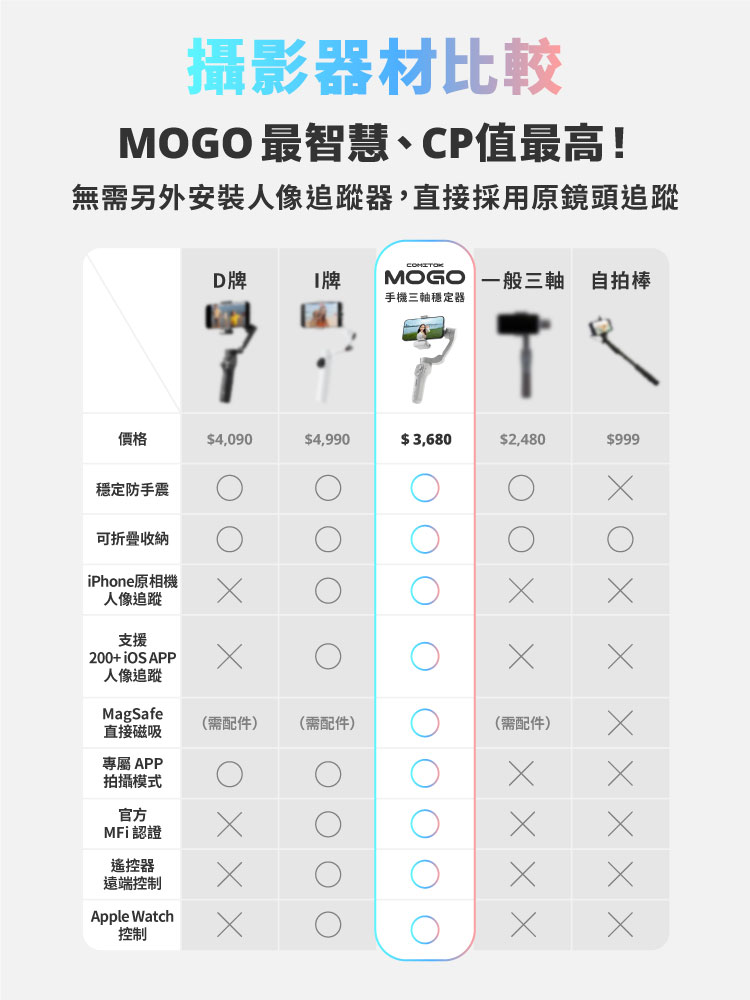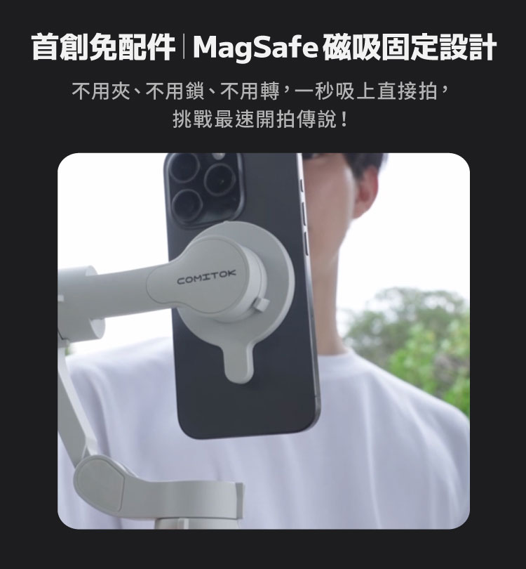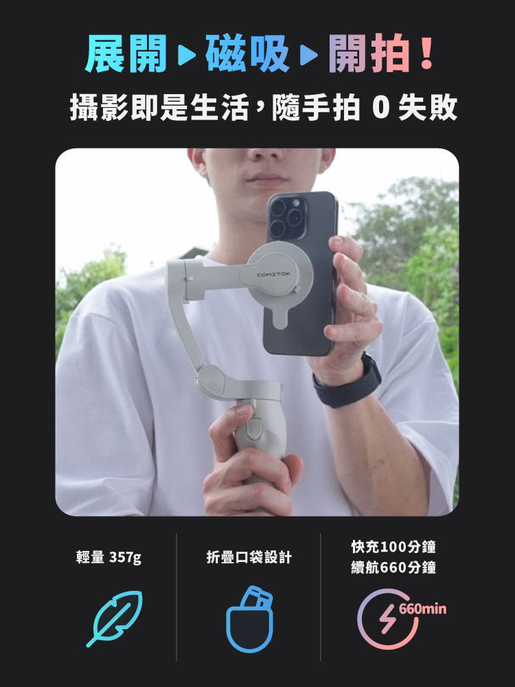 COMITOK MOGO 手機三軸穩定器,結合專業穩定技術與智慧 AI 功能,為日常拍攝與內容創作帶來全新體驗。內建三軸防手震系統,有效降低晃動與抖動,讓影片畫面更加平穩流暢,不論是走拍、運動或旅遊記錄,都能輕鬆拍出專業質感。