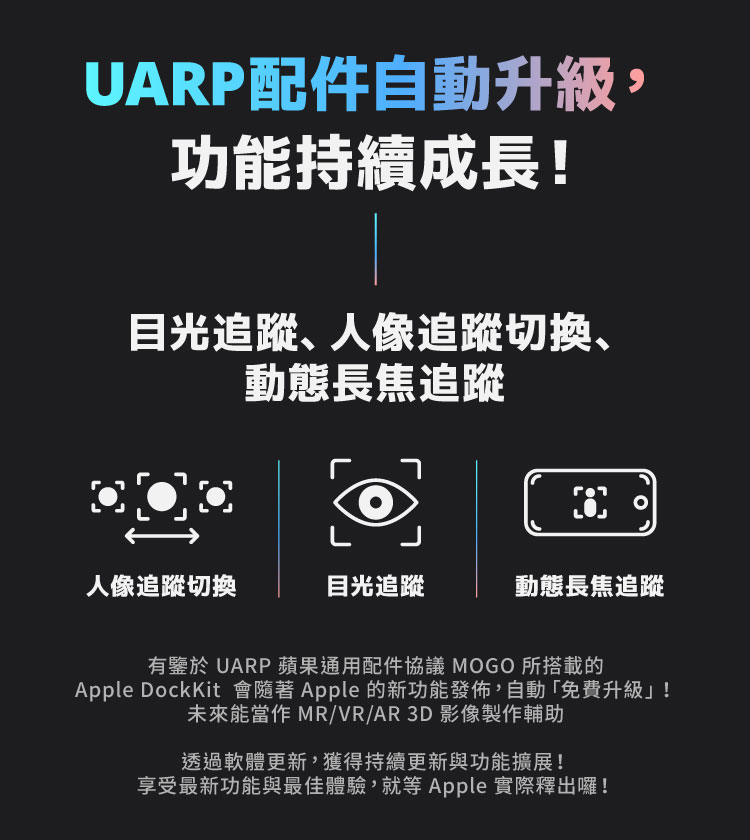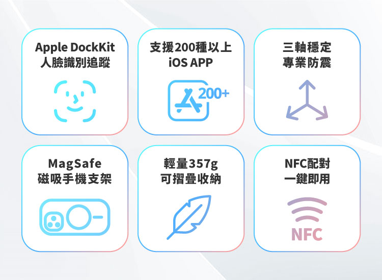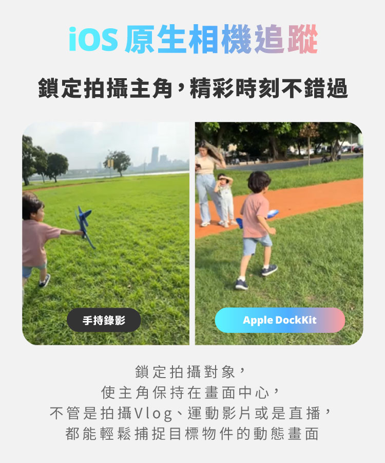 搭載 DockKit AI 智慧追蹤技術,可自動辨識並鎖定拍攝主體,實現即時跟拍效果,特別適合 Vlog 創作者、直播主或單人拍攝使用,無需他人協助也能完成流暢畫面。支援多種拍攝模式,滿足日常紀錄、短影音創作與社群分享需求。